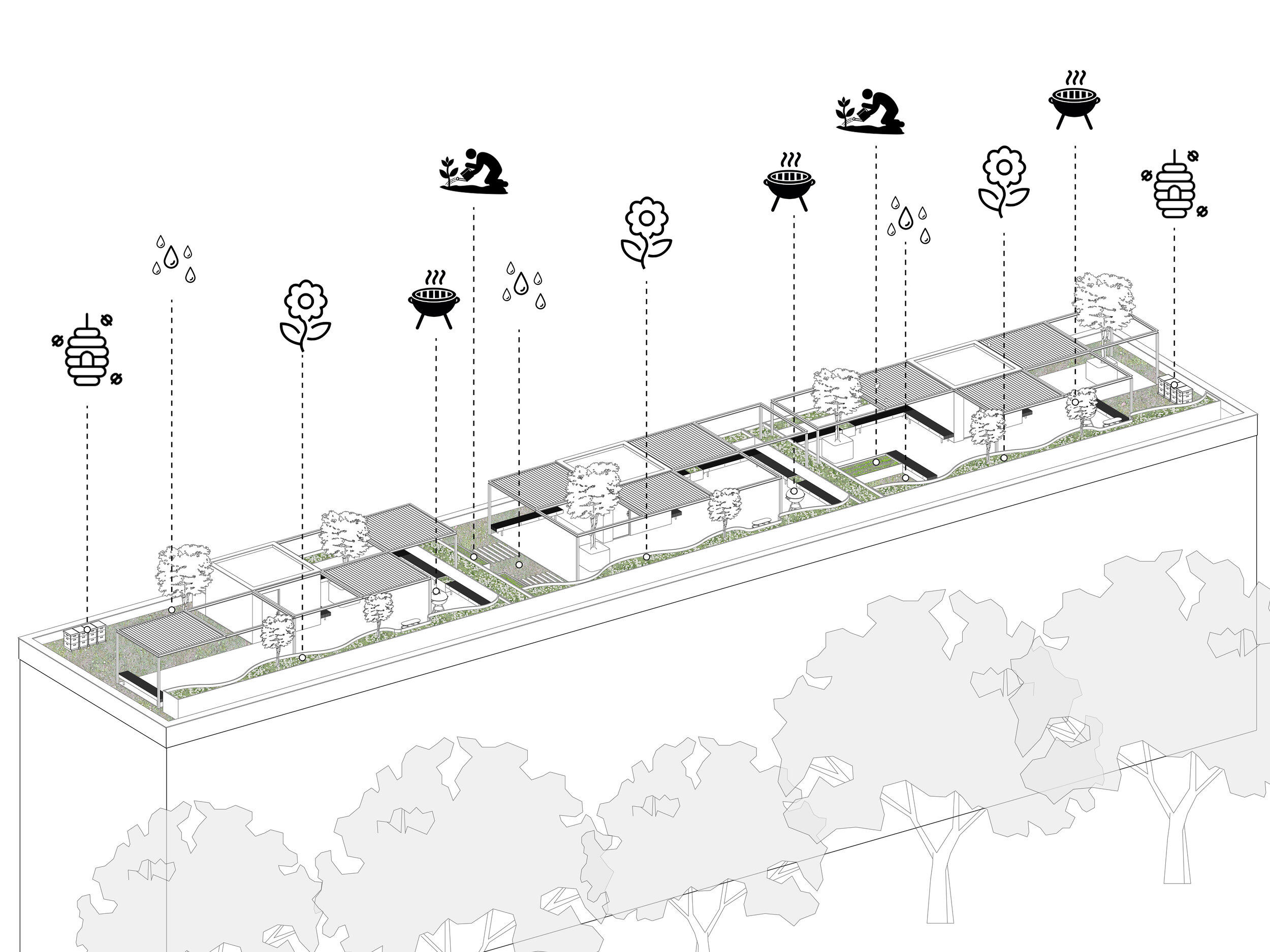 Zeleň dopĺňa, oddeluje a filtruje terasy, racionálne oddelené podľa príslušných vchodov. Zlepšuje sa klíma vnútorných priestorov, vegetácia je prirodzeným izolantom pred chladom v zime a teplom v horúcich letných dňoch. V neposlednom rade vzniká možnosť na umiestnenie a chov včiel a včelých úľov na strechách obytných súborov.