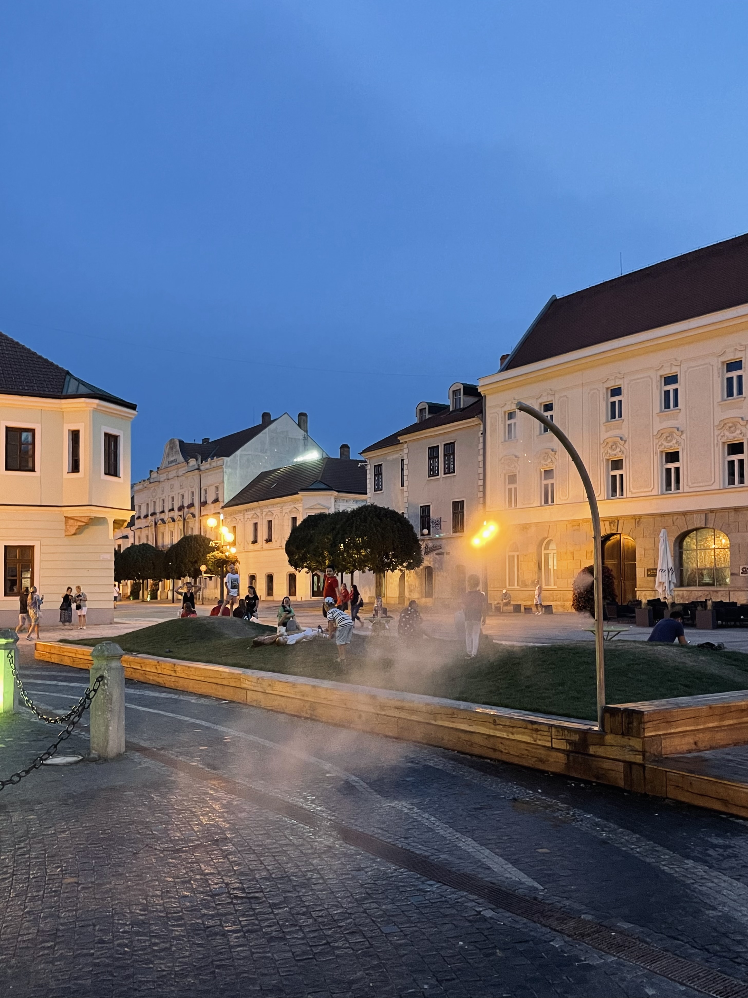 Na východnej strane, takmer v strede námestia sa nachádza pobytová pyramída – plató, s trávnikom. Na jeho vrchole sú umiestnené neformálne sedacie prvky - textilné vaky.